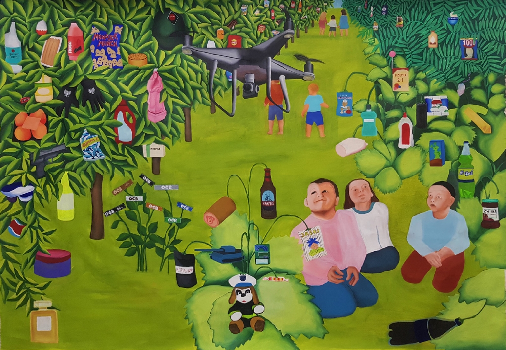 Moim projektem dyplomowym jest zbiór współczesnych baśni, które napisałam i zilustrowałam. Jest to historia o baśniowej krainie borykającej się z problemami natury globalizacyjnej, takimi jak lasy obrastające w produkty, które bohaterowie chciwie zrywają, powodując tym epidemię bezsenności. Baśnie poruszają między innymi problem policyjnej brutalności i toksycznej męskości, snując poetyckie teorie o tym, skąd się wzięła policja na świecie i skąd się wzięły zjawiska takie jak brutalność, nacjonalizm, władza czy wojna. Wydźwięk ogólny jednak jest pozytywny, baśnie roztaczają wizję radosną i dającą nadzieję, proponując nieoczywiste rozwiązania problemów, z którymi boryka się ludzkość.