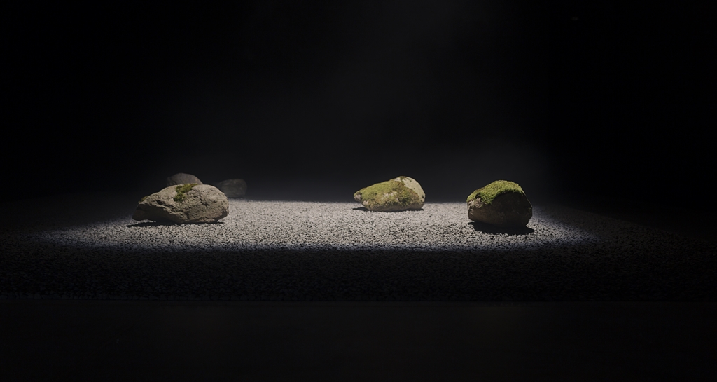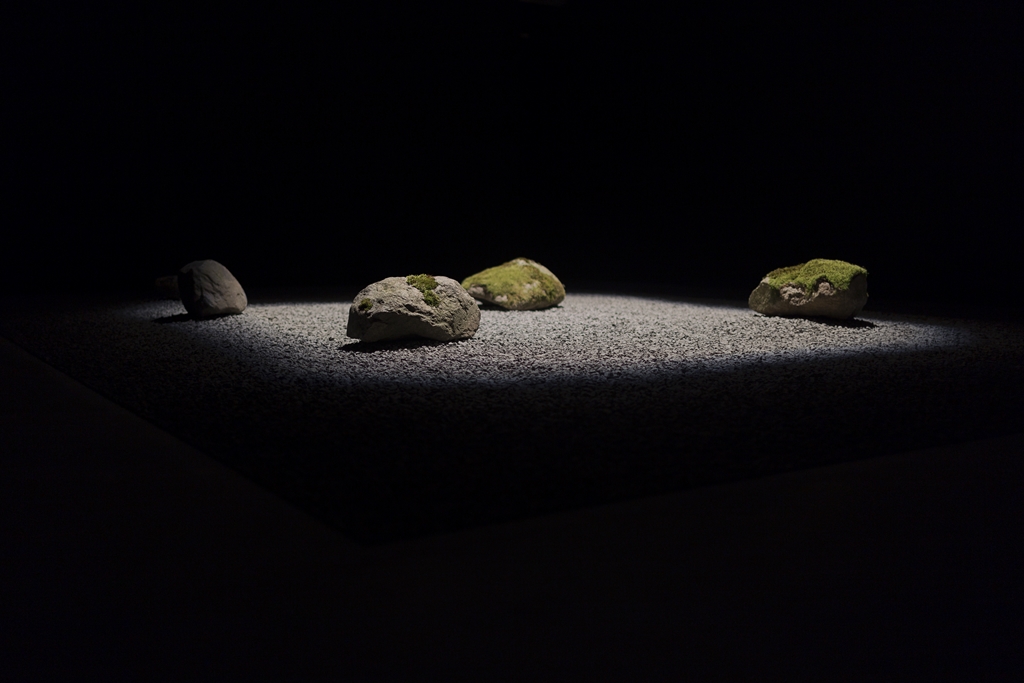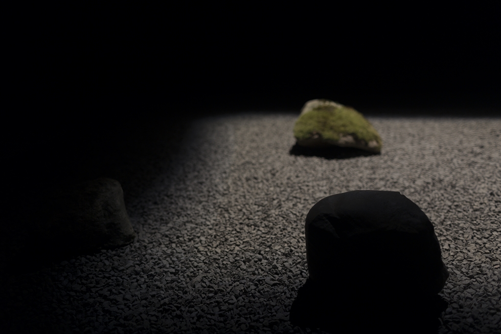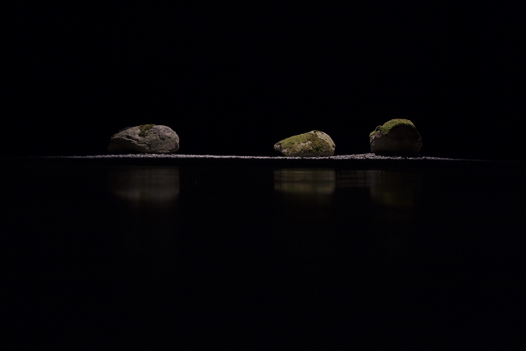 Myślę o momencie tuż przed końcem czasu. Nawiązująca do sztuki japońskich „suchych ogrodów” pozbawiona tytułu kompozycja przestrzenna jest niemą sceną powolnego trwania w zaniku. Osiadłe na krawędzi widzenia kamienne formy nie tworzą własnej narracji ani nie muszą zostać zrozumiane. Milczą, i dopiero wobec tego milczenia możliwa staje się właściwa, niełatwa i nieobiecująca ukojenia kontemplacja.