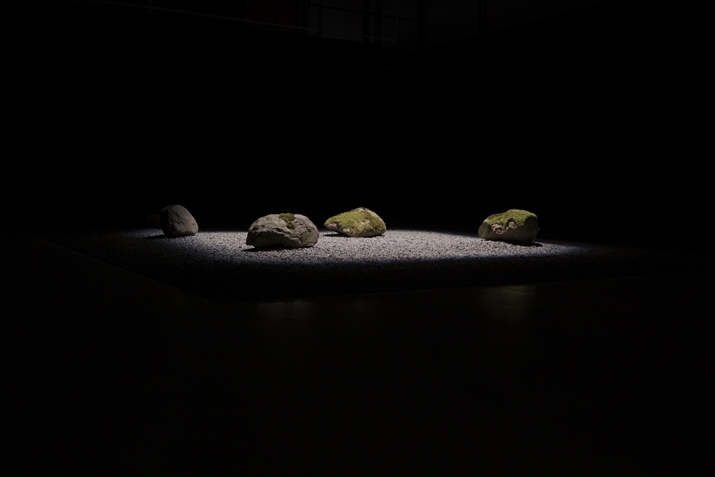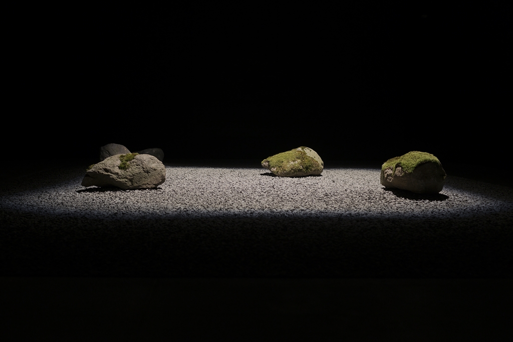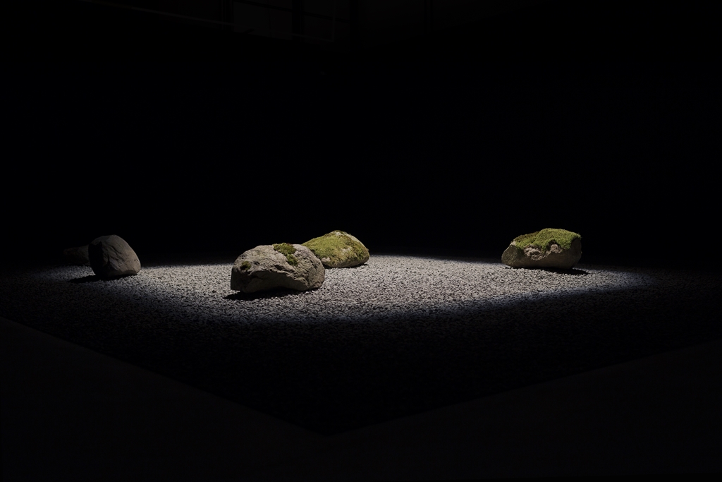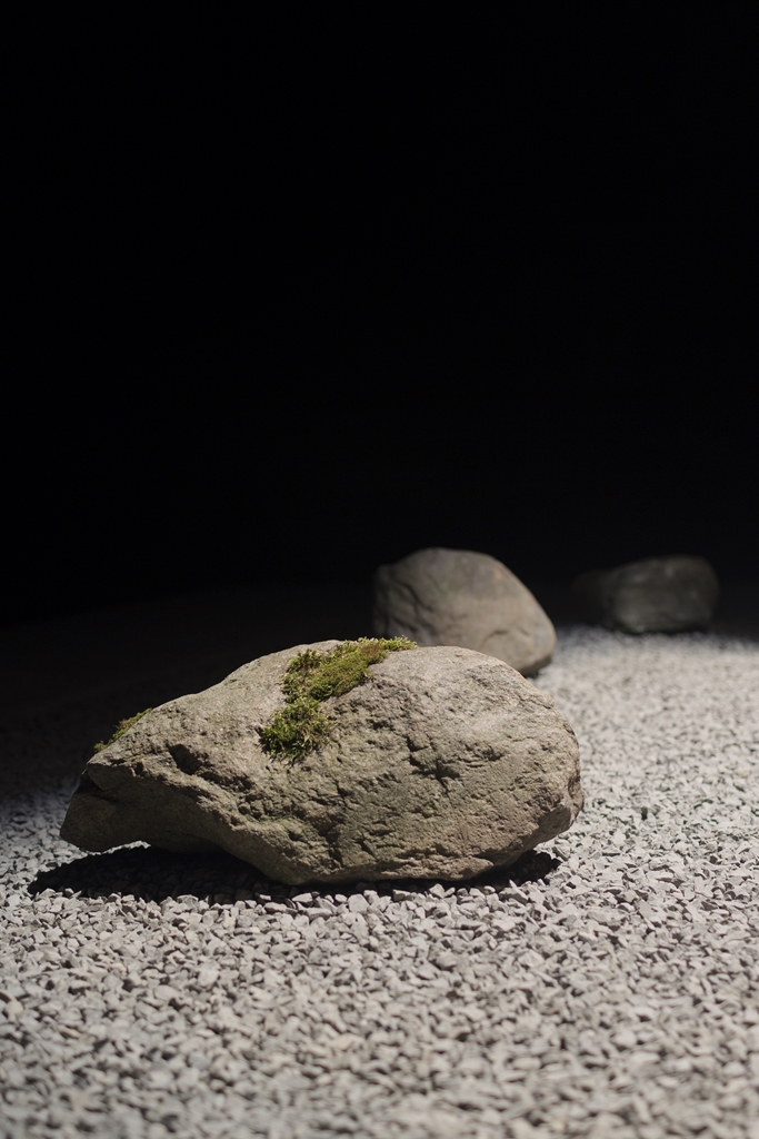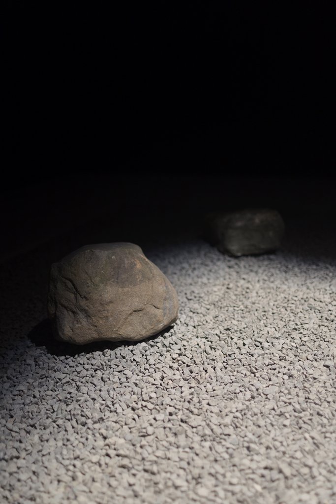 Myślę o momencie tuż przed końcem czasu. Nawiązująca do sztuki japońskich „suchych ogrodów” pozbawiona tytułu kompozycja przestrzenna jest niemą sceną powolnego trwania w zaniku. Osiadłe na krawędzi widzenia kamienne formy nie tworzą własnej narracji ani nie muszą zostać zrozumiane. Milczą, i dopiero wobec tego milczenia możliwa staje się właściwa, niełatwa i nieobiecująca ukojenia kontemplacja.